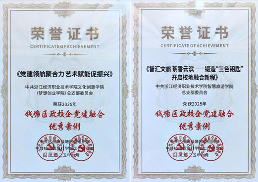 近年来,钱塘科学城依托14所高校、25万师生、近百万校友,以“钱塘校融”党建融合为统领,以区校合作为抓手,构建环大学城党建共同体,打造“科创风火轮”党建阵地,实施“博士入企”“校企双进”等品牌行动,构建党建与生产力跃迁发展、同频共振的党建新局面,并涌现出了一大批区政校企党建融合优秀案例。学校智慧旅游学院党总支的《智汇文旅茶香云滨——锻造“三色钥匙” 开启校地融合新程》,文化创意学院党总支的《党建领航聚合力 艺术赋能促振兴》2个案例获表彰。