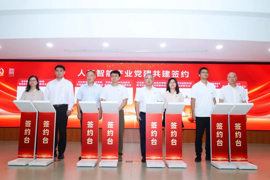 活动现场,钱塘高校人工智能院系党组织和大创小镇人工智能企业,已成立党组织的人工智能企业和尚未成立党组织的人工智能企业签署党建联建协议,未来将以党建为纽带,实现资源共享、优势互补,共同构建“党建引领、校企协同、产教融合”的人工智能产业发展新格局。学校数字财经学院党总支与杭州微点创新科技有限公司党支部进行了现场合作签约。