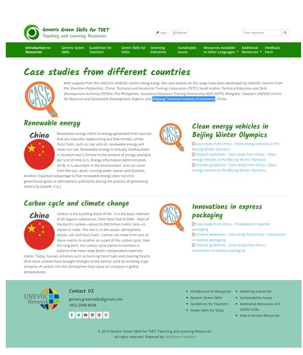 This Resource Library, as a project of UNESCO-UNEVOC Headquarters, is led by the Education University of Hong Kong, aiming to integrate green vocational skills into vocational education and TVET teacher training programs, and jointly built by UNESCO-UNEVOC Centers from China, Mongolia, Philippines, Saudi Arabia, Nigeria, etc. Our institute and Shenzhen Polytechnic participated in this project on behalf of China. The External Affairs Office organized teachers from Culture and Art School and Commerce Circulation School to participate in the project.