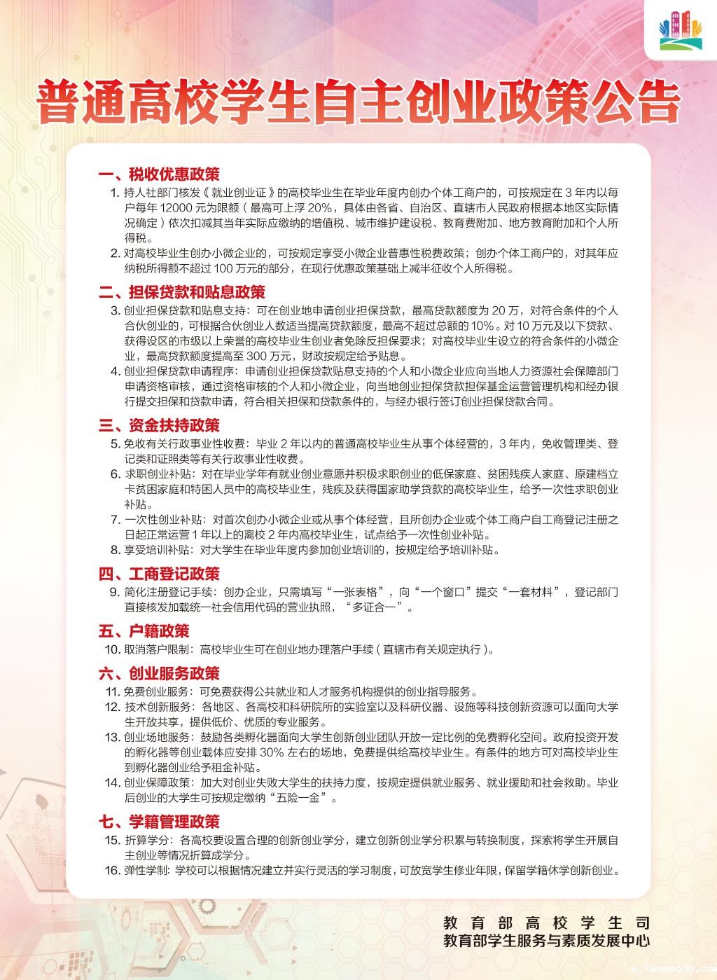 普通高校学生自主创业政策公告